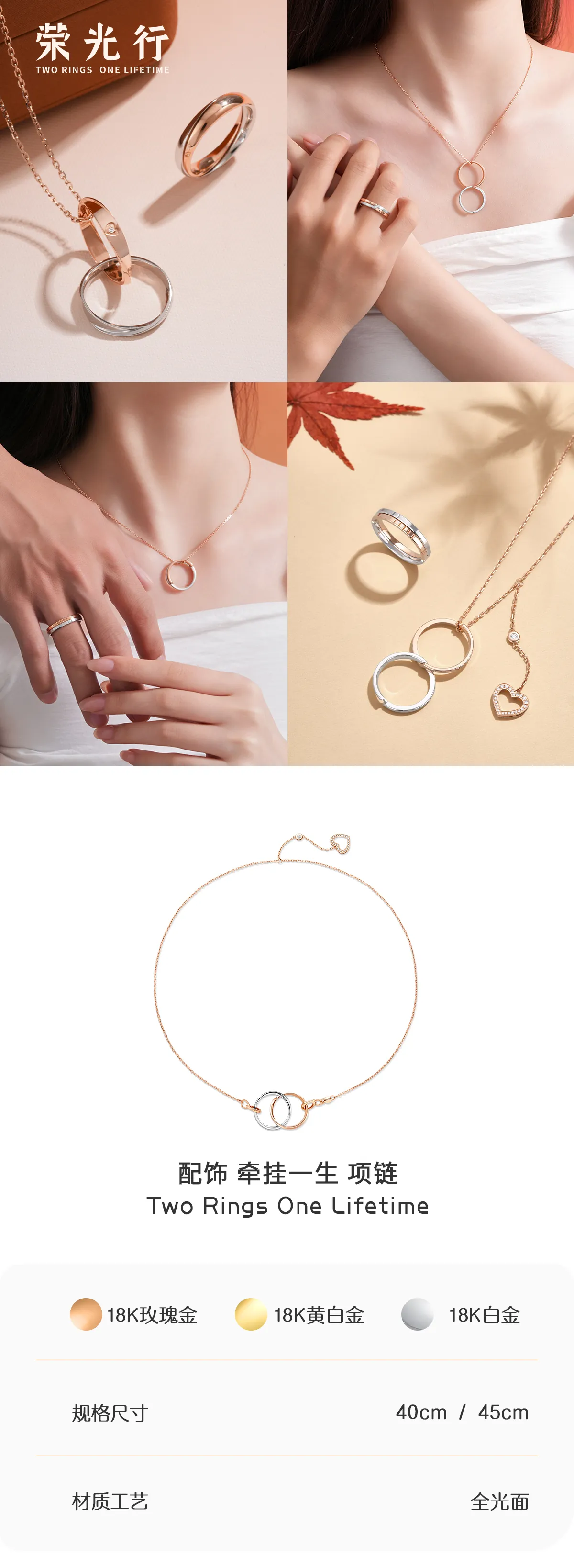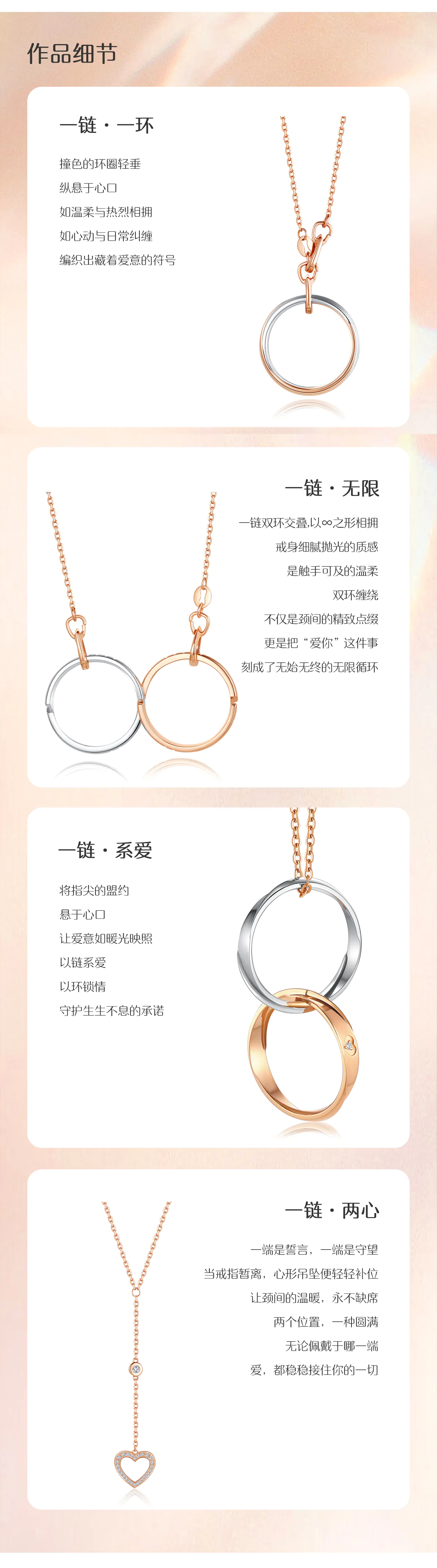 无名指是爱的港湾,心口是它的主场。 “随行项链”,一饰三形,工作时自在随行,生活里与呼吸同频,让爱有了万般模样。 当戒指暂离,心形吊坠便轻轻补位,无论佩戴于哪一端,爱都稳稳接住你的一切。 参考编号:QR001 金属:18K玫瑰金 宝石:钻石