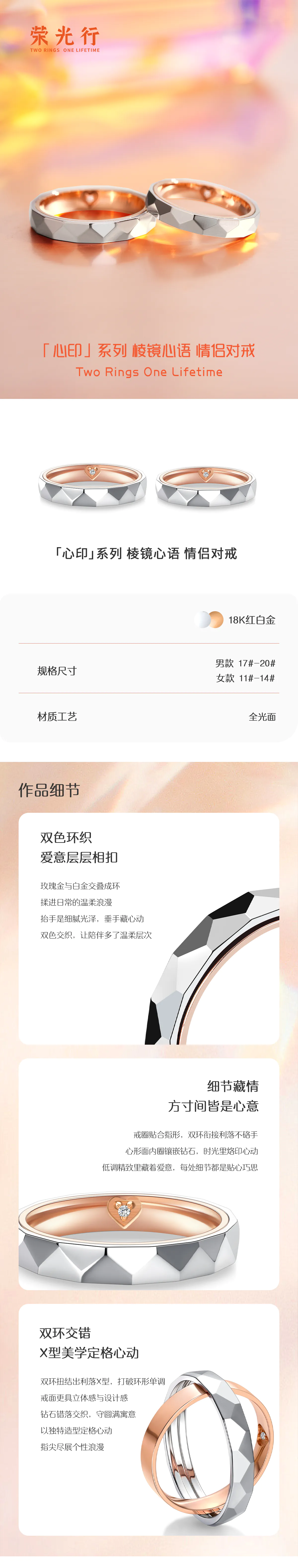 棱镜般的立体切面,是光的诗行,将每一缕经过的日光与灯火,温柔捕捉。于是,每一次抬手,都成为光的仪式。 心跳的形状,轻轻印在离脉搏最近的地方。当金属的温度与肌肤的呼吸日夜相融,痕迹便成为记忆的私语。 内圈暖金,外圈素白。独特可转动设计,一者动,一者静,独立亦相依。 男款编号:ZY10005 女款编号:ZY10006 金属:18K玫瑰金, 白金 宝石:钻石