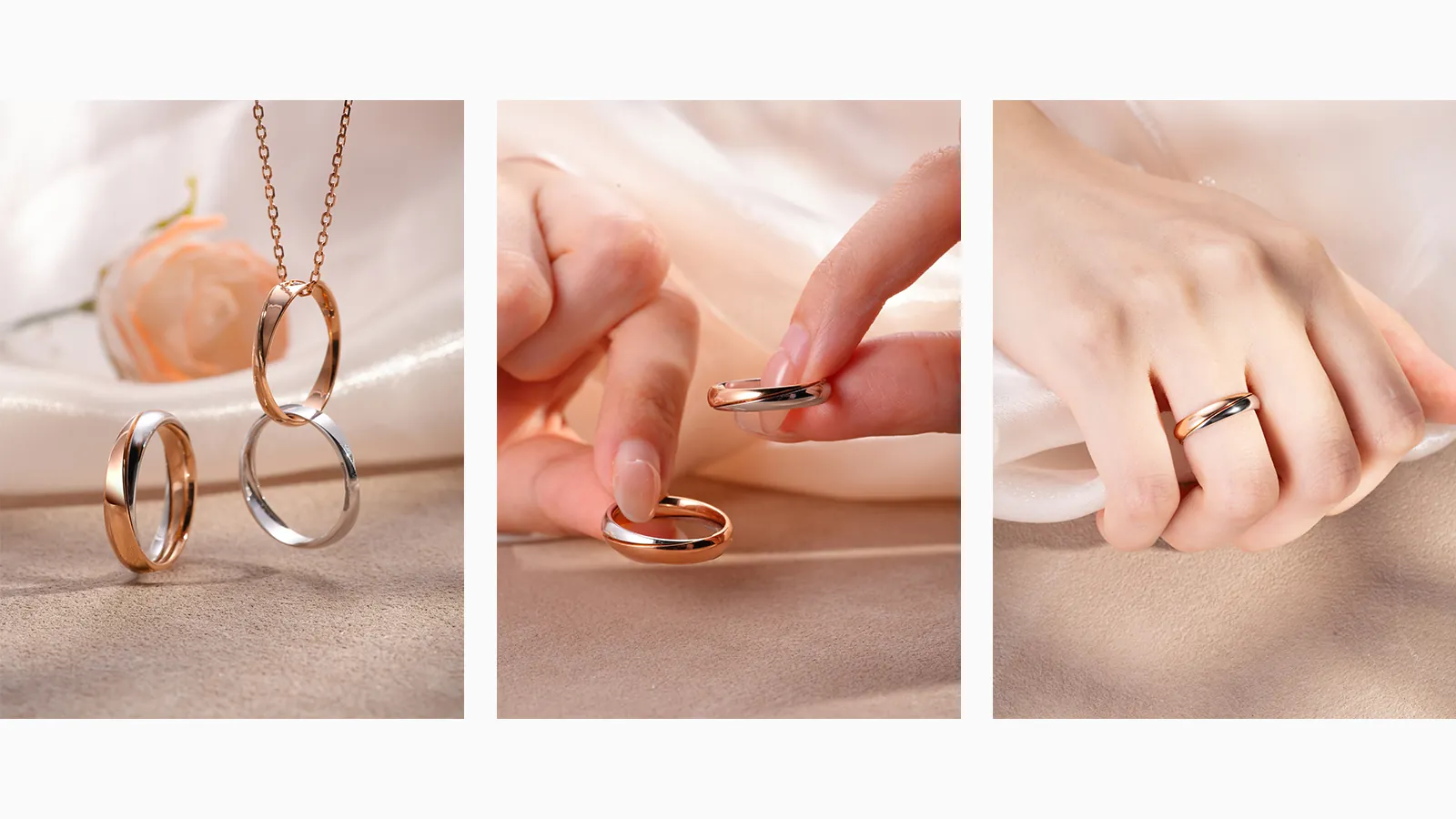 为此,荣光行以独特的“开”、“旋”、“合”双色分戒设计诠释爱情哲学。用一枚枚精心雕琢的戒指,讲述一场场彼此成全、双向奔赴的最美爱情故事。