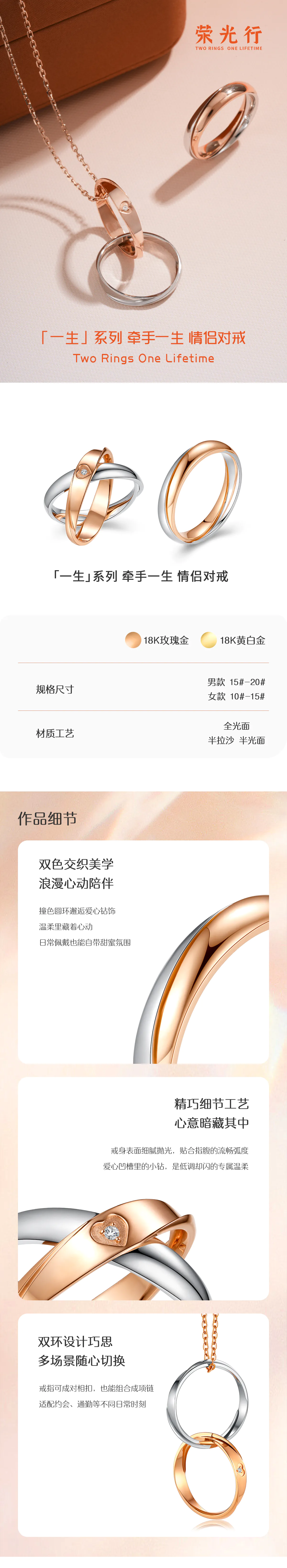 一枚戒指,双环交叠。分开时,两环交叉成“∞”无限符号;合体时,纹理与线条严丝合缝。 “内弧+外弧”经典戒型,造型简洁经典,更深含“结草衔环、至死不负”的誓言。 精控版型,即忠于设计,又贴合指骨曲线,双环合一时严丝合缝。 男款编号:Q2001RLM 女款编号:Q2001RLW 金属:18K玫瑰金,白金 工艺:半拉沙半光面