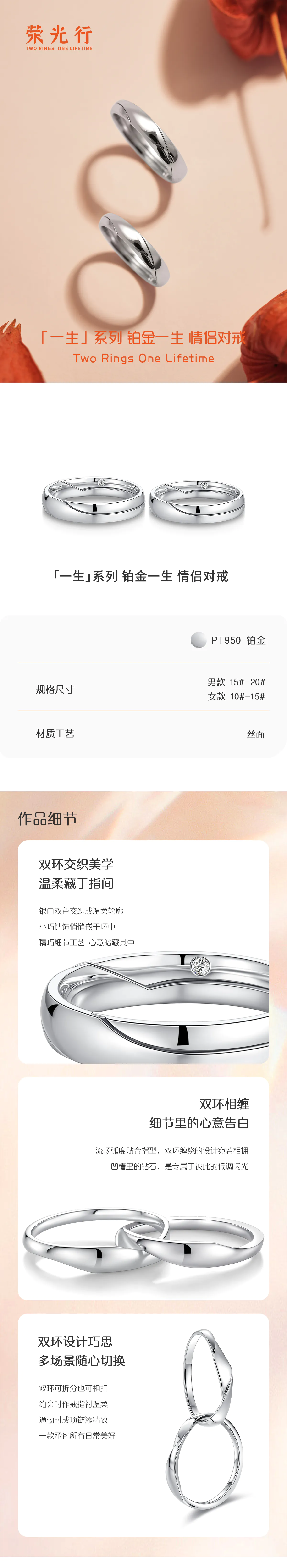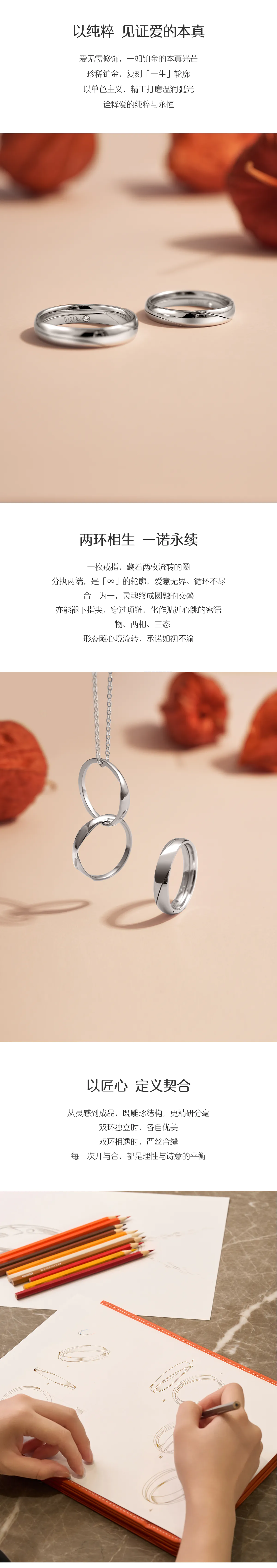 珍稀铂金,复刻「一生」轮廓,以单色主义,诠释爱的纯粹与永恒。 一枚戒指,藏着两枚流转的圈。分执两端,是「∞」的轮廓;合二为一,灵魂终成圆融的交叠。 从灵感到成品,即雕琢结构,更精研分毫;每一次开与合,都是理性与诗意的平衡。 男款编号:R2569M 女款编号:R2570M 金属:铂金 Pt950 工艺:丝面