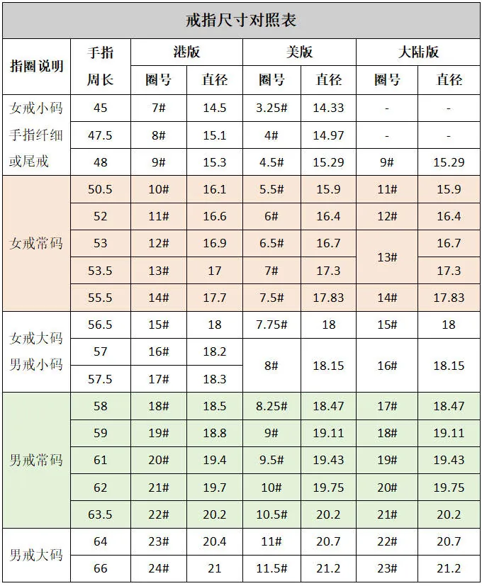 最后,我们为大家附上一份戒指尺寸对照表,您可以根据测量得到的手指周长或戒指内直径,轻松找到适合自己的指圈号。希望这些方法和建议能帮助您选购到完美贴合的戒指!