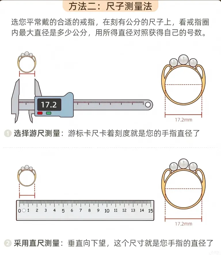 如果你已经有了一枚合适佩戴的戒指,可以用以下两种方式快速测量出戒指的尺寸,从而确定自己的圈号。