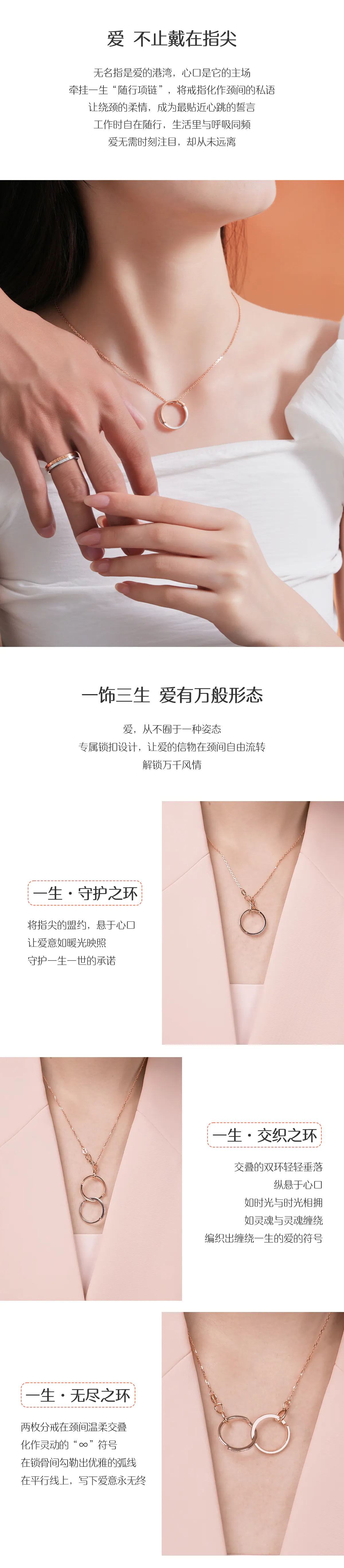 无名指是爱的港湾,心口是它的主场。 “随行项链”,一饰三形,工作时自在随行,生活里与呼吸同频,让爱有了万般模样。 当戒指暂离,心形吊坠便轻轻补位,无论佩戴于哪一端,爱都稳稳接住你的一切。 参考编号:QR001 金属:18K玫瑰金 宝石:钻石