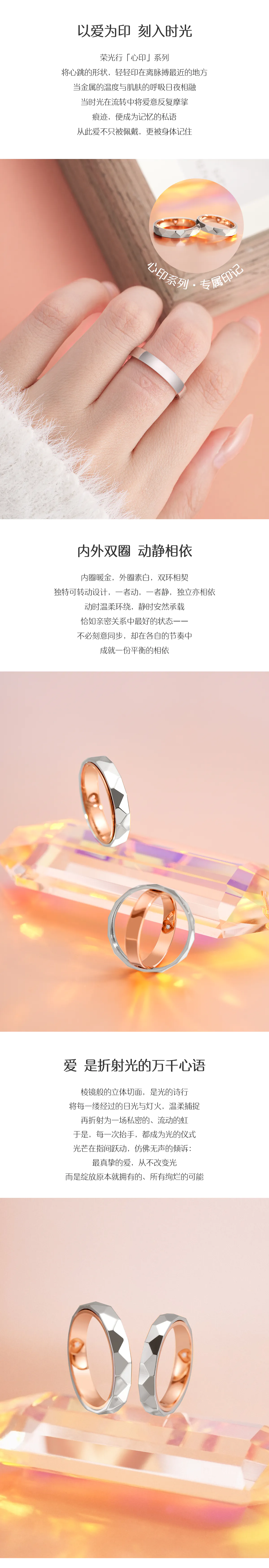 棱镜般的立体切面,是光的诗行,将每一缕经过的日光与灯火,温柔捕捉。于是,每一次抬手,都成为光的仪式。 心跳的形状,轻轻印在离脉搏最近的地方。当金属的温度与肌肤的呼吸日夜相融,痕迹便成为记忆的私语。 内圈暖金,外圈素白。独特可转动设计,一者动,一者静,独立亦相依。 男款编号:ZY10005 女款编号:ZY10006 金属:18K玫瑰金, 白金 宝石:钻石