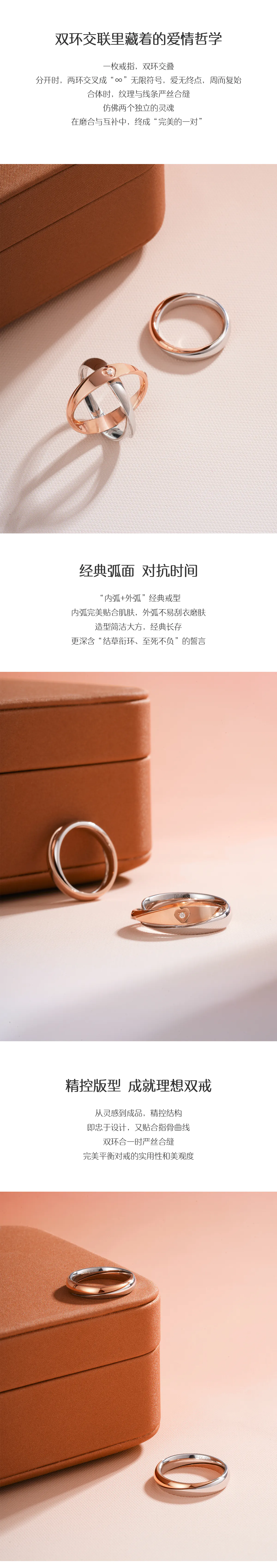 一枚戒指,双环交叠。分开时,两环交叉成“∞”无限符号;合体时,纹理与线条严丝合缝。 “内弧+外弧”经典戒型,造型简洁经典,更深含“结草衔环、至死不负”的誓言。 精控版型,即忠于设计,又贴合指骨曲线,双环合一时严丝合缝。 男款编号:Q2001RLM 女款编号:Q2001RLW 金属:18K玫瑰金,白金 工艺:半拉沙半光面